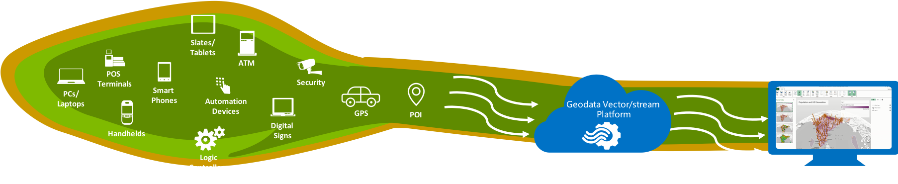 云计算,物联网和移动互联网的发展产生了海量的空间数据,这些空间数据具有实时性强、数据量大、数据种类多的特点。Geodata Vector/stream Platform通过自主研发的时空索引结合开源大数据架构提供了大规模矢量/流式数据接入、存储、处理、分析和可视化的功能。赋予了企业对大规模矢量/流式数据的管理和挖掘的能力。