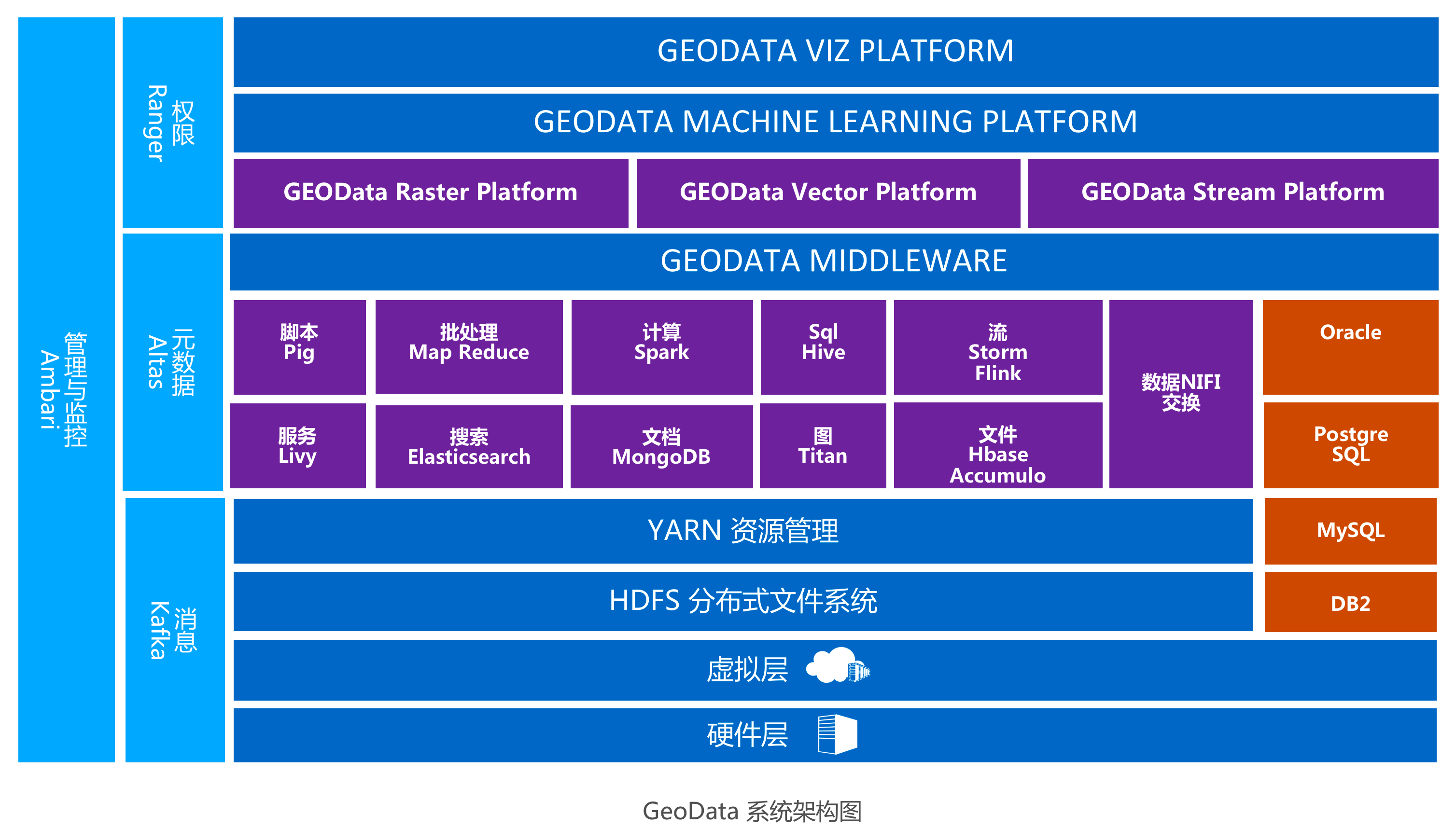 Geodata智能时空数据平台是基于开源分布式系统Hadoop生态体系,结合自主研发的Geodata中间件建立的时空大数据分布式平台
